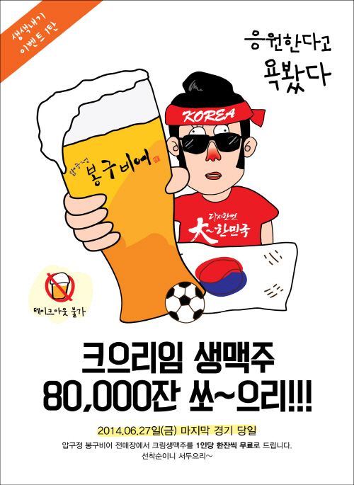 스몰비어 전문점 압구정 '봉구비어'가 '대한민국VS벨기'에 경기가 열린 27일 오후 5시 이후 압구정 봉구비어 전 매장을 방문한 8만 명에게 크림생맥주를 무료 제공하는 이벤트를 벌인다.