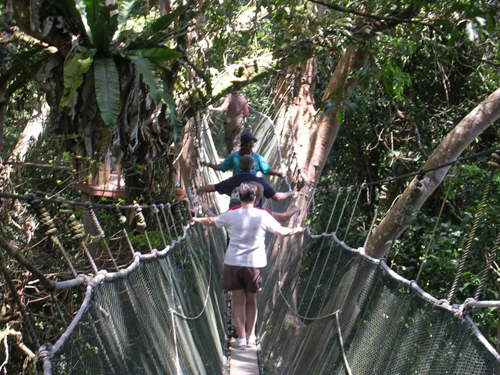 나무보다 높은 25M 높이에 와이어와 나무판을 이어 만든 캐노피 다리를 걸으며 정글의 생생한 느낌을 감상할 수 있다. 문의=하나투어(1899-6740).