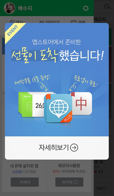 지난 5월에 추가된 스마트폰 관리 기능 또한 강화됐다. 백업 기능이 적용돼 네이버 아이디만 있으면 스마트폰을 교체해도 이전에 다운로드 받았던 앱 목록을 간편하게 확인할 수 있다. 내가 보유한 전체 앱 목록도 게임, 유틸리티 등으로 나눠서 보여주고 카테고리별 인기앱도 제공한다.