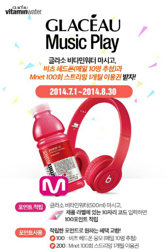 글라소 비타민워터를 마시고 포인트를 모으면 포인트에 따라 비츠 헤드폰 추첨행사에 응모하거나 Mnet 100회 스트리밍 1개월 이용권을 받을 수 있다.