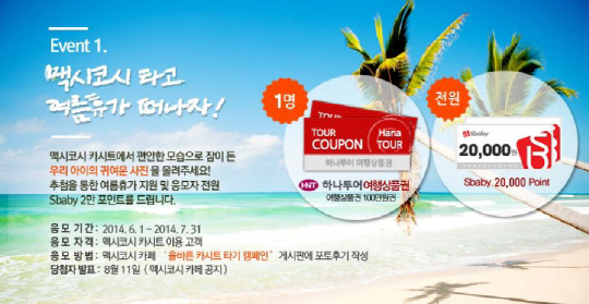 맥시코시는 '제주 오토하우스' 전용 카시트 선정을 기념하해 7월 31일까지 네이버 맥시코시 카페(http://cafe.naver.com/maxicosi)에서 고객 감사 이벤트를 실시한다. 이벤트는 맥시코시 카시트 이용 고객이면 누구나 참여 가능하며, 맥시코시 카페(http://cafe.naver.com/maxicosi)의 '올바른 카시트 타기 캠페인' 게시판에 포토후기를 작성하면 완료된다. 당첨자는 8월 11일 네이버 맥시코시 카페를 통해 발표하며 1등 1명에게는100만원 상당의 하나투어 여행상품권을 증정한다. 응모자 전원에게는 YKBnC 자사몰 에스베이비몰(www.sbaby.co.kr)에서 사용가능 한 2만포인트를 지급한다.