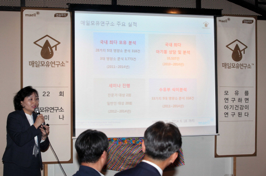 매일유업이 지난달 30일 '제22회 매일모유연구소 전문가 세미나'를 진행했다. 매일모유연구소 정지아 소장이 주제를 발표하고 있다. 사진제공=매일유업