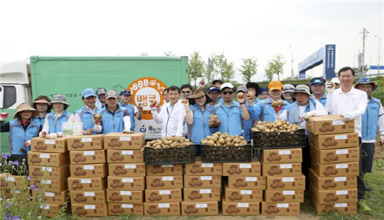 이날 봉사단원들은 500㎏ 분량의 유기농 감자를 수확한 뒤 10㎏상자 50개 박스에 나눠 '푸드뱅크'에 기부했다. 소외계층에 식품 복지 서비스를 지원하는 푸드뱅크는 경정공원에서 생산된 감자를 하남시 소외계층과 장애인복지단체 등에 전달할 예정이다.