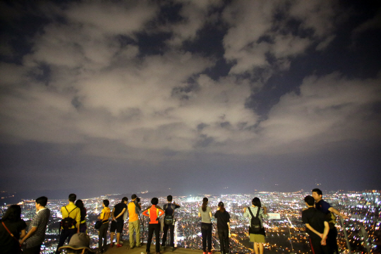 앞산전망대에서 대구 야경을 즐기는 사람들