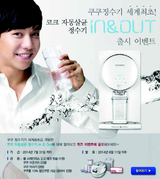 건강생활가전기업 쿠쿠전자(대표 구본학, www.cuckoo.co.kr)가 '코크 자동살균 정수기 인앤아웃(IN&OUT)' 출시를 기념해 온라인 이벤트를 진행한다.