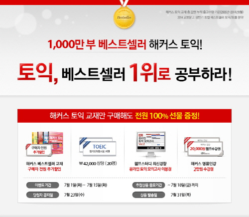 해커스어학연구소 김미준 대표이사는 "해커스가 토익 전문 교육기관으로 수험생들에게 인정받기까지 해커스의 노력이 집약된 교재의 공이 컸다"며 "해커스토익 교재는 발간 이후 꾸준히 베스트셀러이자 스테디셀러로 수험생들에게 큰 사랑을 받고 있는 만큼 그 사랑에 보답하고자 토익 교재 할인 이벤트를 진행하니 많은 혜택을 받아가길 바란다"고 전했다.