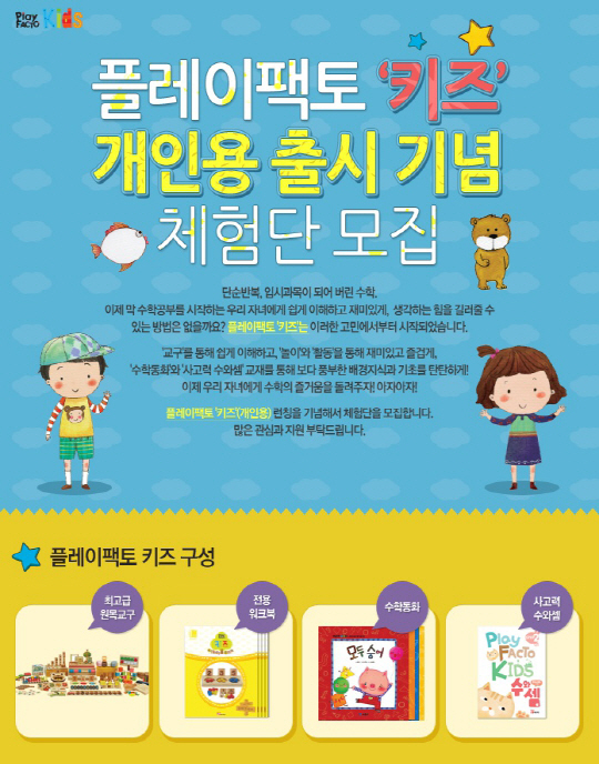 교육 출판 및 온라인서비스 기업 ㈜타임컨텐츠(대표 이길호)의 유·초등 수학교구 '플레이팩토(Play FACTO, www.playfacto.co.kr)'가 학부모 체험단을 모집한다.