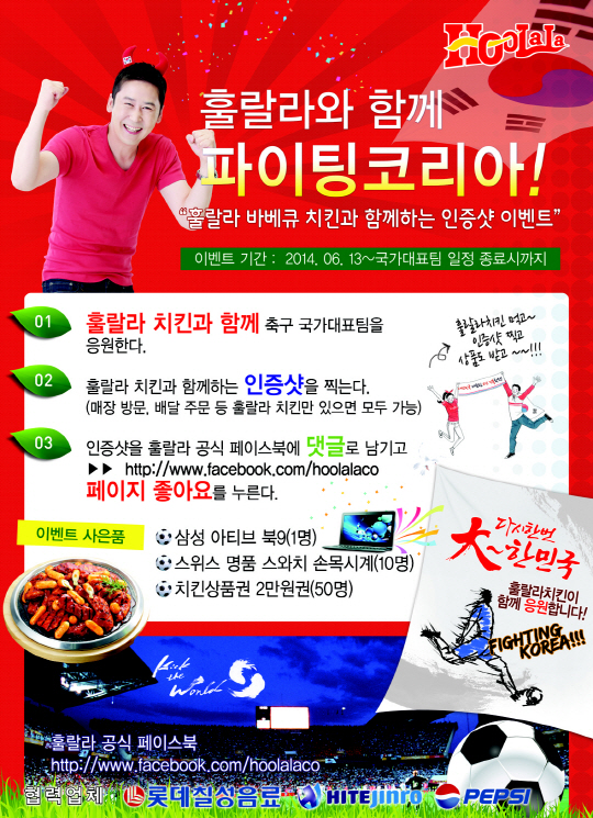 훌랄라는 지난 6월 13일부터 대한민국 대표팀 경기 일정 종료시점까지 훌랄라 공식 페이스북(www.facebook.com/hoolalaco)에 훌랄라 바베큐 치킨 매장 방문, 배달 주문 등 어디서든 훌랄라 치킨과 함께한 인증사진과 대표팀 응원 댓글을 올리고 '좋아요'를 누르면 응모자에게 추첨을 통해 경품을 전달하는 이벤트를 열었다. 추첨을 통해 1명에게 삼성 아티브북 9라이트 노트북을, 10명에게는 스와치 손목 시계, 50명에게는 치킨상품권 2만원권이 각각 전달될 예정이다. 당첨자는 7월중 훌랄라 공식 페이스북을 통해 발표될 예정이다.