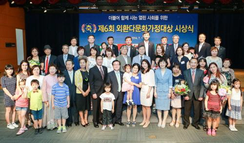 ◇시상식에 참석한 이복실 여성가족부 차관, 이자스민 새누리당 국회의원, 라울 허낸데즈 주한 필리핀 대사(Ambassador Raul Hernandez), 응우엔 마잉 동 주한 베트남 부대사(Nguyen Manh Dong, Deputy Head of Mission of Embassy of Vietnam), 신현승 외환은행 영업총괄그룹 부행장이 수상자 및 가족, 참석한 내외빈과 기념 촬영을 하고 있다.