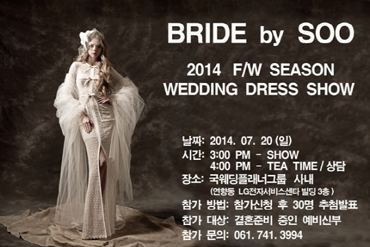 이에 국웨딩플래너그룹의 웨딩드레스 브랜드인 'Bride by SOO'는 전남 동부지역 예비신부들을 위해 신상 웨딩드레스를 마음껏 감상하고 품평할 수 있는 자리를 마련했다. 바로 'BRIDE by SOO 2014 F/W SEASON WEDDING DRESS SHOW'이다.