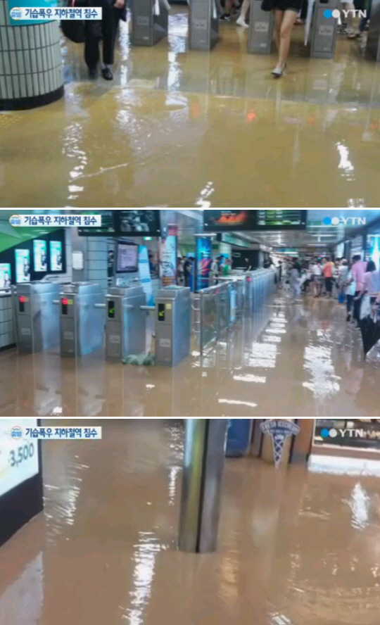 서울메트로에 따르면 이날 오후 10시 10분께 1번 출구쪽 인근 건물과 대합실을 잇는 에스컬레이터 설치 공사 현장을 통해 빗물과 흙이 유입되면서 많은 곳은 5㎝가량 물이 차올랐다.