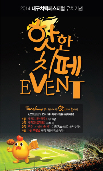 땅땅치킨이 4일 2014 대구 치맥페스티벌에 참여를 기념, 전국 땅땅치킨 전 매장에서 '2014 대구 치맥페스티벌 유치기념 핫한치페이벤트'를 진행한다고 밝혔다.