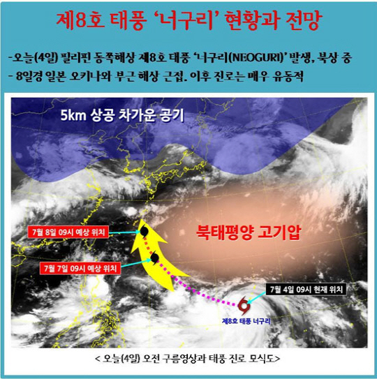 '너구리'는 현재 중심기압 998헥토파스칼(h㎩)에 최대풍속 초속 18m, 강풍반경 250km인 약한 소형 태풍. 오는 8일에는 높은 해수면 온도 구역을 지나면서 9일 강한 중형 태풍으로 발달할 것으로 예측되고 있다.
