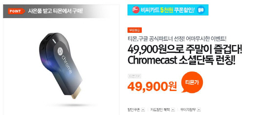 티몬 이종호 가전디지털팀장은 "티몬만의 가전디지털 제품 판매 경쟁력을 인정받아 소셜커머스 업계에선 유일하게 구글의 제품을 팔 수 있게 됐다"며 "크롬캐스트 판매를 시작으로 구글과 좋은 파트너십을 유지하겠다"고 밝혔다.