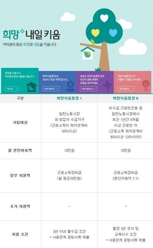 희망키움통장 적립기간은 3년으로 재무·금융 교육을 이수하면 적립금을 받게 되며, 지원금은 주택구입·임대, 본인·자녀의 교육·훈련, 사업 창업·운영자금 등으로 제한된다.