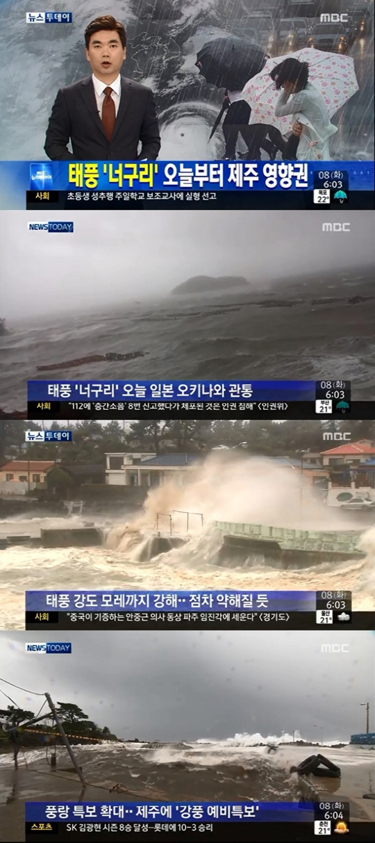 태풍 너구리가 내일 오후 제주 남쪽, 목요일 오전엔 서귀포 동쪽으로 이동함에 따라 우리나라 전역이 태풍 영향권 안에 들 것으로 예상된다.