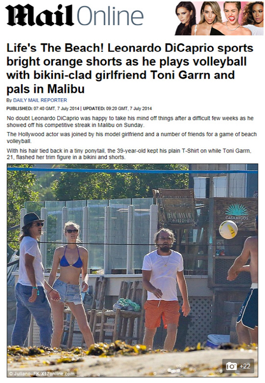 해당 사진에 따르면 레오나르도 디카프리오는 여자친구 토니 가른(Toni Garnn)과 해변에서 비치발리볼을 즐기고 있는 모습이다.