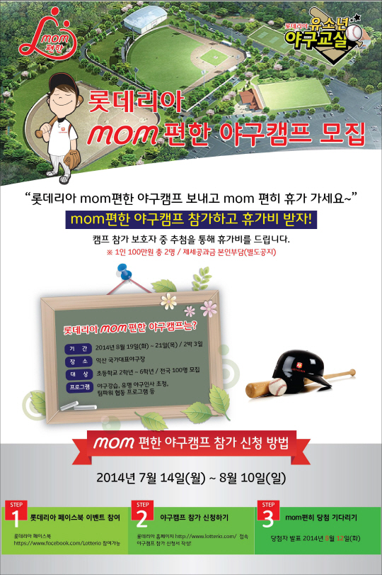 '롯데리아 Mom 편한 야구캠프'에 참가를 원하는 이들은 14일부터 8월 10일까지 롯데리아 페이스북(www.facebook.com/lotteria)에서 이벤트에 참여한 뒤 롯데리아 홈페이지(www.lotteria.com)를 통해 신청서를 작성하면 된다.
