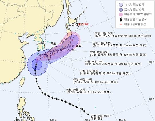 기상청은 태풍이 북상하면서 점차 약화되겠으며 10일 오전 3시께 서귀포 동남동쪽 약 230㎞ 부근 해상에 위치할 것으로 전망했다.