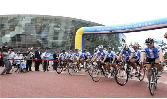장애인과 비장애인이 둘이서 하나 되어 달리는 국토종단 550㎞ 자전거길 '아름다운 도전'이 지난 6일 광명스피돔에서 시작했다.
