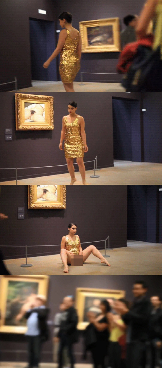 공개된 영상에는 '세상의 기원' 그림 앞에 치마를 입은 한 여성이 다리를 벌리며 앉으며 성기를 노출했고 미술관 관계자들은 달려가 제지했다.