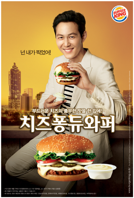 한편, 버거킹은 15일부터 이정재를 내세운 치즈퐁듀와퍼 TV CF를 방영한다. 치즈퐁듀와퍼를 제대로 즐기는 이정재의 부드러운 먹방을 다시 한 번 선보이며 소비자들의 식욕을 자극할 예정이다.