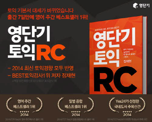 한편, 최근 영단기가 출간한 '토익 RC'는 55만 취업준비생이 선정한 BEST 토익강사 1위인 정재현 강사가 직접 집필한 최신 교재로, 2014년 최신 토익시험의 출제 경향까지 모두 반영해 변화하는 토익 유형에 최적화 되어 토익을 공부하는 학생들에게 큰 인기를 얻고 있다.