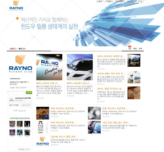 레이노 코리아의 공식 블로그는 ▲ 레이노 코리아 소개 및 최신 소식을 제공하는 카테고리를 비롯해 ▲ 자동차용 필름, ▲ 건축용/스마트 필름, ▲ 모두의 RAYNO 등 크게 5개의 카테고리로 구성된다. '자동차용 필름'에서는 제품 소개 및 자동차와 관련된 실속 있는 정보를 다루며, '건축용/스마트 필름'은 제품 소개와 함께 다양한 테마의 인테리어 팁을 제공한다. 특히, '모두의 RAYNO' 에는 필름을 시공한 고객들이 직접 후기를 작성하고, 서로 소통할 수 있는 창구로 '써보니까 어때?' 코너를 마련했다.