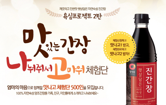 신청자 중 500명을 체험단으로 선정, '햇살담은 자연숙성 진간장'(840㎖) 4개 세트를 제공한다. 선정된 체험단은 본인과 제품을 나눈 지인들을 각각 체험단으로 등록하고 제품을 나누는 인증 사진과 사용 후기 등 주어진 미션을 수행하면 된다. 주어진 미션을 완료하면 청정원 장류 축하세트를 지급한다.