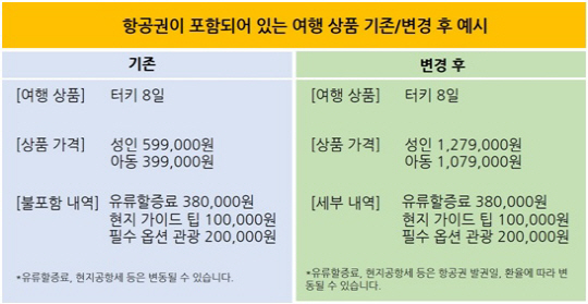 국토교통부는 모든 여행상품에 유류할증료와 공항시설사용료, 그리고 추가비용이 포함된 총액요금으로 표시하도록 하는 항공법시행령 개정안이 지난 8일 국무의회를 통과, 15일부터 본격적으로 시행된다고 밝혔다.