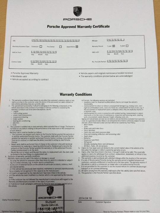 포르쉐 리프레시 캠페인은 보증기간이 지난 포르쉐 차량에 대한 무상점검 서비스. 하지만 중고차를 구입했던 A씨는 혹시나 하는 마음에 올 4월 포르쉐 보증 연장 서비스를 분당 포르쉐센터에서 가입하기로 하고, 보증연장을 하기 위해서는 포르쉐의 정밀 테스트를 받았다. 이때 들어갔던 비용은 보증연장비 약 280만원에다 검사비 25만원을 포함해 총 300여만원에 달했다. 엔진, 미션, 기타 동력계통 보증이 연장된 기간은 2015년 4월19일까지다.