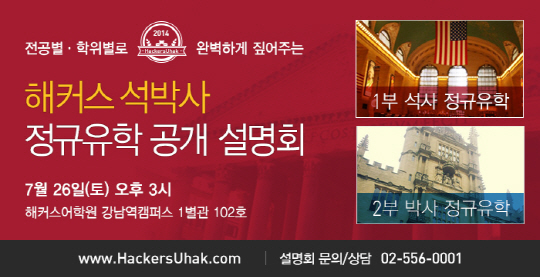 이번 설명회는 26일 오후 3시부터 1시간 30분 동안 해커스 강남역캠퍼스 1별관 102호에서 진행한다. 1부에는 석사 입학 지원방법과 지원절차, 자격요건 및 미국과 영국의 석사지원 합격전략안내, 전공별 석사입학 성공 사례 등 석사 정규유학에 대한 모든 정보를 공개한다. 2부엔 1부 커리큘럼과 동일한 순서로 박사 정규유학에 필요한 정보를 알려준다. 미국과 영국 중 유학국가 선택에 도움을 주기 위해 각 국가의 유학전문가 강연을 통해 나라별 석박사 취득에 필요한 비교 분석을 제공한다.
