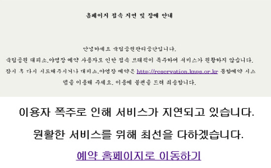 국립공원관리 공단 홈페이지에는 "국립공원 대피소. 야영장 예약 사용자로 인한 접속 트랙피이 폭수하여 서비스가 원활하지 않다. 잠시 후 다시 시도해주거나 대피소. 야영장 예약은 'http://reservation.knps.or.kr' 통합예약 시스템을 이용해 달라. 이용에 불편을 드려 죄송하다"는 안내문구가 나오고 있다.