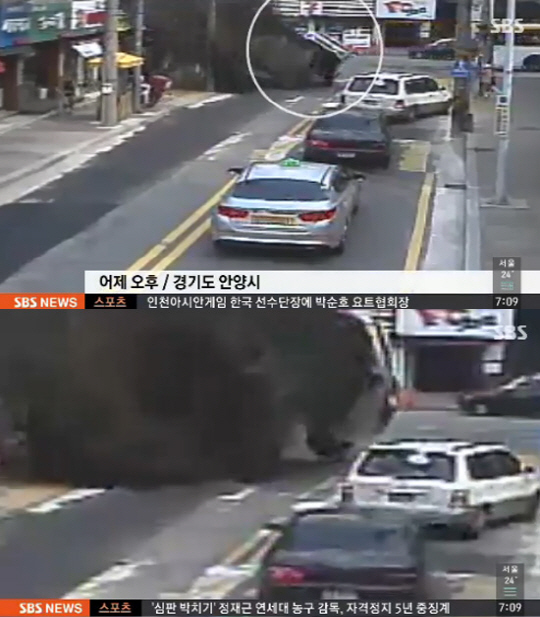 이 사고로 인근을 지나던 택시가 뒤집혀 기사 신모(56)씨가 경상을 입고 병원으로 옮겨졌고 인근 상가 유리창 2장이 파손됐다.