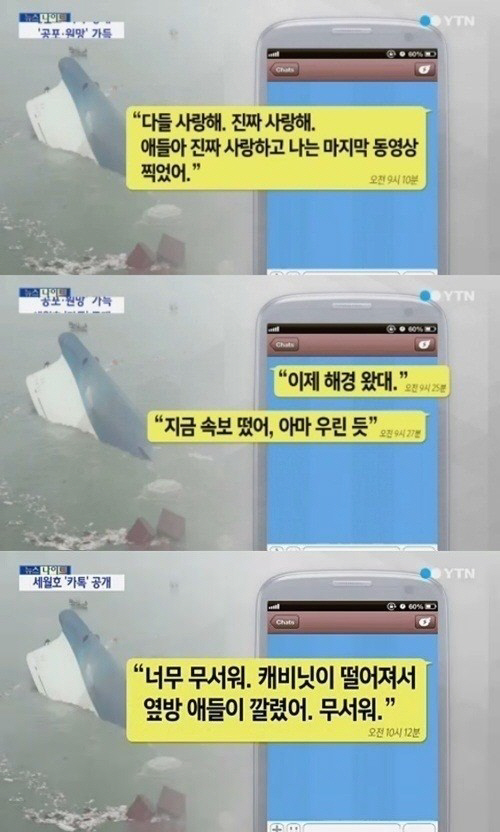 하지만 오전 9시 29분 "아직 움직이면 안 돼", 오전 9시 41분 "방송도 안 해줘. 그냥 가만히 있으래"라며 무책임한 선상 근무를 지적하는 대화내용이 담겨 있어 보는 이들의 울분을 자아냈다.