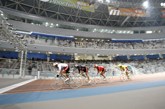 지난 11일 제16회 국민체육진흥공단 이사장배 전국사이클 대회가 개최된 가운데 일반부 선수들이 경북 영주 경륜훈련원 벨로드롬에서 4㎞ 단체추발 경기를 벌이고 있다. 이번 대회는 16일 종합시상식을 끝으로 마무리 됐다.