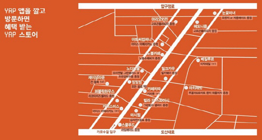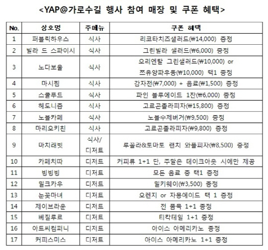 '스쿨푸드', '커피스미스' 등의 프랜차이즈부터 '퍼블릭하우스', '빌라 드 스파이시' 등 가로수길에서만 찾아볼 수 있는 곳까지 총 17개 매장에서 YAP의 팝콘 및 모바일 쿠폰 서비스를 직접 체험해볼 수 있다.