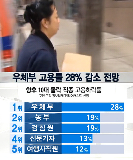커리어캐스트는 미국 노동통계국의 고용전망 자료를 토대로 2012∼2022년 사이 우체부의 고용하락률이 모든 직종 가운데 가장 높은 28%에 달할 것이라고 예측했다. 이메일, 소셜네트워크의 발달이 요인이다.