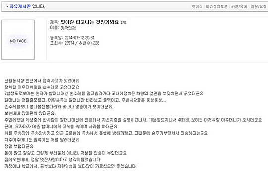 해당글에 따르면 7살의 손주가 할머니 대신 손수레를 끌고 가던 중 실수로 정차된 아우디 차량을 긁었다.