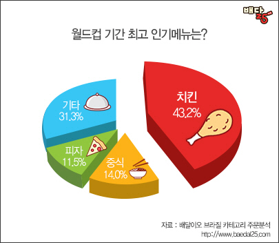 배달주문 앱 '배달이오'는 월드컵 기간(6월 13일~7월 14일) 브라질 심야영업 카테고리에 있는 업소로 들어온 통화 주문을 분석한 결과 치킨의 주문 건수가 전체 주문 건수의 43.2%를 차지해 가장 인기 있는 메뉴에 선정됐다고 밝혔다. 그리고 중식이 14%의 점유율을 차지하며 뒤를 이었다.