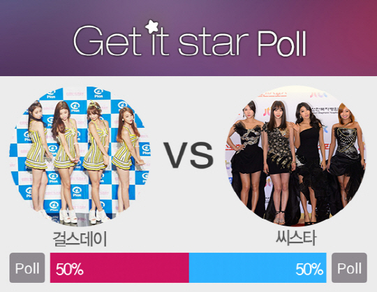 걸스데이와 씨스타의 대결은 오는 7월 18일부터 8월 1일까지 진행되며, 투표결과는 8월 2일에 발표됩니다. 지금 바로 겟잇스타에 접속해서 스타의 팬클럽에 가입하고 POLL에 참여해서 가수들의 컴백을 응원해주세요. 자세한 어플 소개는 스포츠조선 겟잇스타 페이지 (http://sports.chosun.dcom/event/app/get_it_star.htm)를 통해 확인하실 수 있습니다.