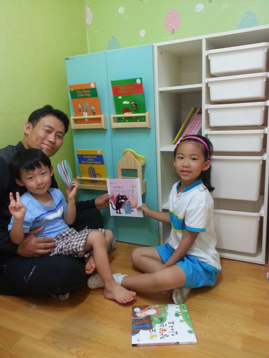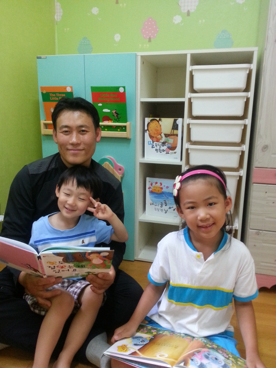 '모모로 톡톡'을 통해 책을 가까이 하는 시간이 더 늘어난 도윤군과 나은양 남매과 아빠 김상목씨와 함께 포즈를 취했다.