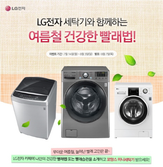 첫 번째로 'LG전자 트롬 세탁기와 함께 하는 여름철 건강한 빨래법' 이벤트는 LG전자 라이프굿 스튜디오 카페(http://cafe.naver.com/lgstudio)를 통해 나만의 건강한 빨래법 또는 빨래습관에 대한 노하우를 공유하는 이벤트다. 카페 이벤트 페이지에 자신만의 ?결 노하우를 덧글로 응모하면 되며, 드럼세탁기 및 통돌이 세탁기 사용자라면 누구나 참여 가능하다.