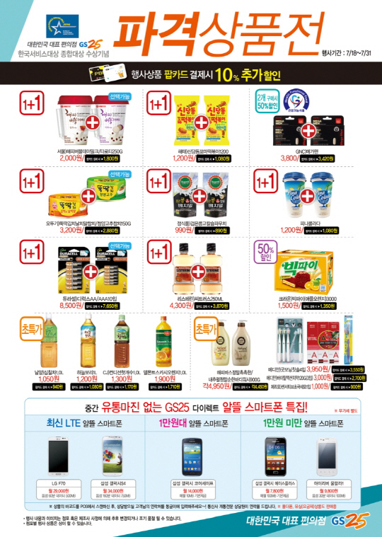 모든 행사상품은 GS25 제휴통신사카드(LGU+, ollehCLUB) 15% 할인에, POP카드로 결제 시 추가 10% 할인까지 더해져 최대 25% 할인 혜택을 누릴 수 있다.