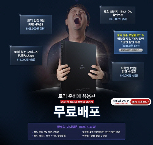 이번 이벤트는 오늘부터 파고다스타 사이트를 통해 실시되며 1만2000세트가 무료로 배포되는 것으로 매일 오전 10시부터 신청이 가능하다. 지난 파고다끝토익vol.1 무료배포 이벤트의 경우 사이트가 마비되는 등의 에피소드가 있었다.