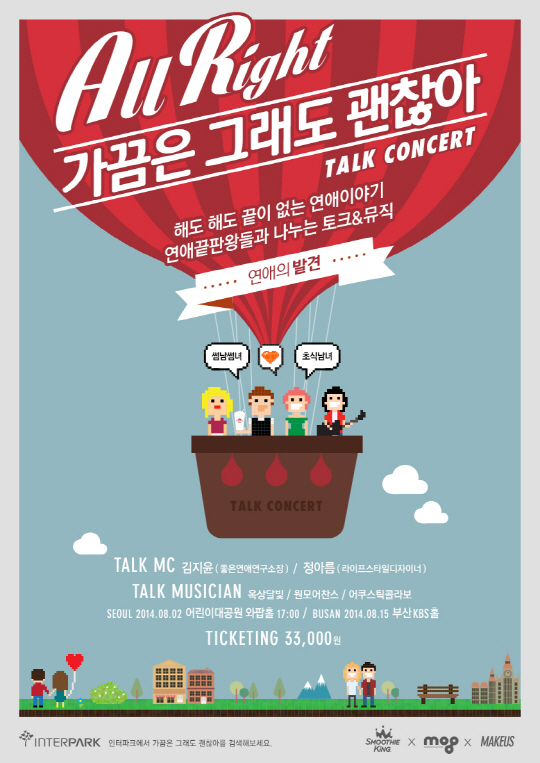 한편, 스무디킹은 인터파크 티켓 예매 페이지에 콘서트 '기대평'과 함께 토크콘서트 공식 트위터를 통해 연애, 다이어트, 진로 등에 대한 다양한 고민을 접수 받고 있다. 접수된 고민들 중 일부를 선정해 토크콘서트 현장에서 다 함께 고민을 풀어보는 시간을 가질 예정이다. '가끔은 그래도 괜찮아' 토크 콘서트는 8월 2일 서울에 이어, 8월 15일 부산에서도 펼쳐질 예정이다.