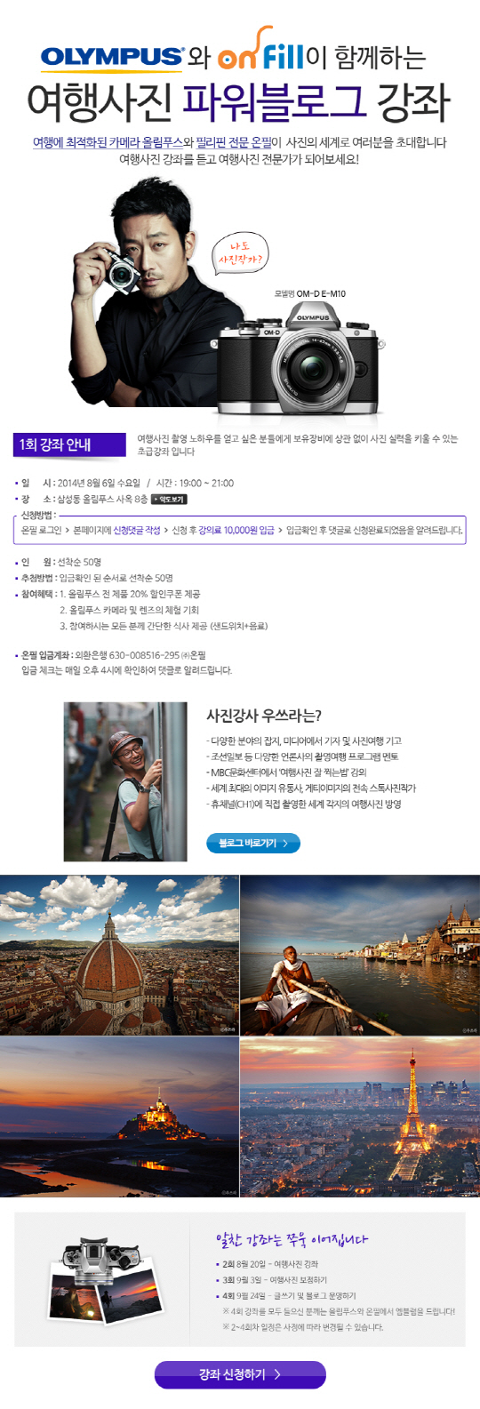 강좌는 총 4회 정규 커리큘럼으로 운영되며 1, 2차 사진찍기, 3차 사진 보정하기, 4차 글쓰기/블로그 운영하기로 진행된다. 4회의 정규 커리큘럼을 모두 수료한 분에게는 온필과 올림푸스에서 제공하는 엠블럼이 지급된다.