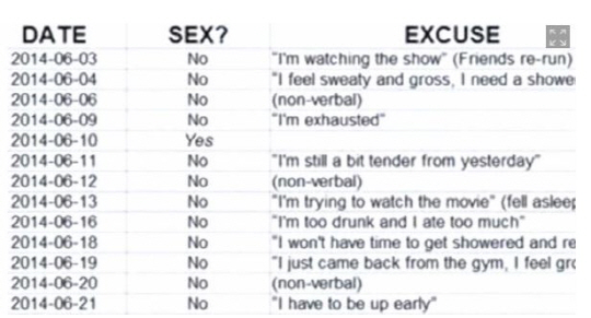 아내가 부부관계를 계속해서 거부하자 화가 난 남편이 날짜와 이유 등을 일목요연하게 표로 정리했다는 황당한 소식이 전해졌다.