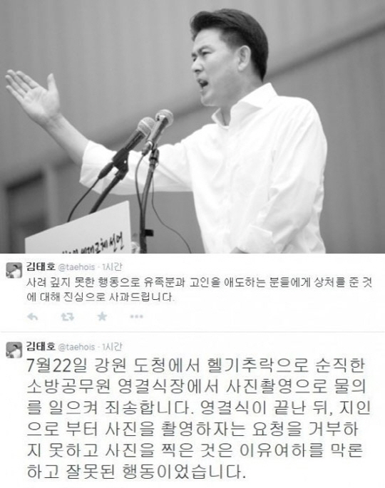순직한 소방공무원들의 영결식에서 새누리당 김태호 최고위원이 기념사진을 찍는 모습이 포착돼 파문을 일으키자 SNS 통해 사과의 말을 전했다.