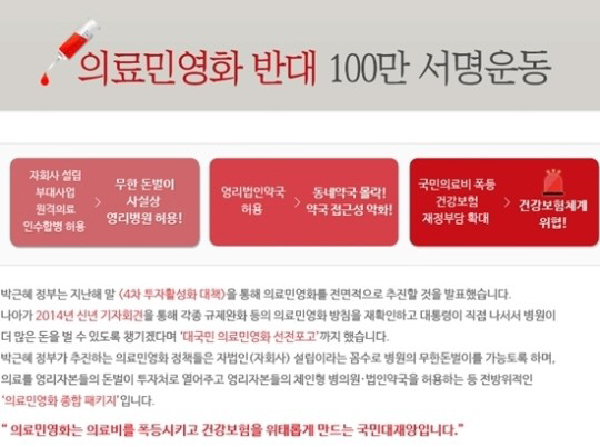 '의료민영화법'으로 불리는 의료법 시행규칙 개정안의 입법예고 마지막 날인 22일 무상의료운동본부 홈페이지에서는 의료민영화 반대 100만인 서명 운동(http://medical.jinbo.net/phpMyAdmin/privaite2.php)이 진행 중이다.